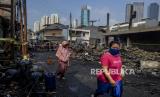 Warga melintas di dekat puing-puing sisa kebakaran di Pasar Timbul, Tomang, Jakarta, Jumat (7/8). Kebakaran yang disebabkan oleh korsleting listrik itu menyebabkan seluruh area pasar dan beberapa ruko sekitar hangus terbakar dan tidak ada korban jiwa dalam peristiwa tersebut. Republika/Putra M. Akbar (FOTO : Republika/Putra M. Akbar)