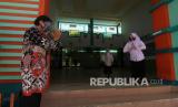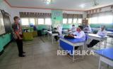 Guru dan siswa melakukan simulasi kegiatan belajar tatap muka di SMPN 1 Pontianak, Kalimantan Barat, Jumat (7/8/2020). Simulasi yang dilakukan guru dan pegawai sekolah dengan menerapkan protokol kesehatan tersebut merupakan salah satu persiapan untuk mengadakan kegiatan belajar tatap muka yang sehat serta bebas COVID-19. (FOTO : Antara/Jessica Helena Wuysang)