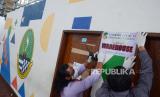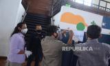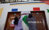 REPUBLIKA.CO.ID, BANDUNG -- Petugas dari Jabar Quick Response Satgasus Covid-19 memasang tanda petunjuk ruangan di GOR Saparua, Kota Bandung, Jumat (7/8).