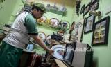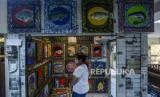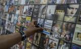 Kolektor menata kaset pita yang terpajang di Galeri Kreasi Perupa Jakarta, Pasar Gembrong Baru, Jakarta, Jumat (7/8). Komunitas Perupa Jakarta membuka Galeri Kreasi Perupa sebanyak 35 kios sebagai wadah untuk menjual koleksi lukisan dan berbagai barang antik. Republika/Putra M. Akbar (FOTO : Republika/Putra M. Akbar)