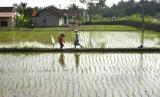 Keberadaan air dari sistem irigasi setempat membantu warga setempat memperoleh air untuk sawah mereka. (FOTO : Wihdan Hidayat / Republika)