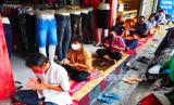 Jamaah shalat Jumat Masjid Al Ittihad, Pejaten, Pasarminggu, Jakarta berdoa di salah satu toko dekat masjid, Jumat (7/8). Meski jarak antar jamaah tidak begitu renggang, jamaah meluber hingga Jl Pejaten. (FOTO : Yogi Ardhi/Republika)