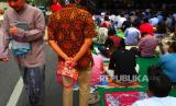 Jamaah shalat Jumat Masjid Al Ittihad, Pejaten, Pasarminggu, Jakarta meluber hingga emperan toko dekat masjid, Jumat (7/8). Meski jarak antar jamaah tidak begitu renggang, jamaah meluber hingga Jl Pejaten. (FOTO : Yogi Ardhi/Republika)