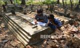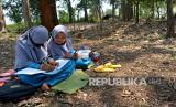 Sejumlah siswa kelas 6 SDN Sumberaji 2 mengerjakan tugas pelajaran sekolah secara daring atau online di kawasan makam Dusun Ngapus, Desa Sumberaji, Kecamatan Kabuh, Kabupaten Jombang, Jawa Timur, Sabtu (8/8/2020). Kawasan makam yang berada lebih tinggi dibandingkan pemukiman warga ini menjadi tempat belajar para siswa dari pagi hingga siang hari karena di lokasi tersebut yang memungkinkan mendapatkan sinyal jaringan internet untuk belajar online atau daring. (FOTO : Antara/Syaiful Arif)