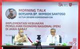 Ketua Dewan Komisioner Otoritas Jasa Keuangan (OJK) Wimboh Santoso (kanan) bersama Sekretaris Daerah Jawa Barat Setiawan Wangsaatmaja (kiri) menghadiri Morning Talk Implementasi Kebijakan Pemulihan Ekonomi Nasional (PEN) di Bandung, Jawa Barat, Minggu (9/8/2020). Wimboh Santoso berkunjung ke Bandung untuk melakukan pertemuan dengan pelaku usaha dalam rangka mendapatkan informasi langsung mengenai kondisi ekonomi dan identifikasi percepatan akses stimulus ekonomi untuk menggerakan sektor riil di Jawa Barat. (FOTO : HUMAS OJK/ANTARA )