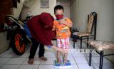 Seorang balita di ukur tinggi badannya ketika dilakukakanya posyandu secara door to door di kawasan Rw 01 Kebon Baru, Tebet, Jakarta, Senin (10/8). Inovasi kegiatan posyandu secara door to door tersebut dinilai lebih efektif demi mengurangi kerumunan orang di saat pandemi Covid-19, namun tetap dengan menerapkan protokol kesehatan.Prayogi/Republika (FOTO : Prayogi/Republika)