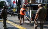 REPUBLIKA.CO.ID, JAKARTA -- Petugas Satpol PP mengawasi pelanggar aturan pembatasan sosial berskala besar (PSBB) melaksanakan sanksi kerja sosial dengan menyapu sampah di kawasan Sabang, Jakarta, Senin (10/8/2020).