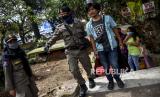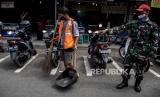 Petugas Satpol PP Kota Cimahi menggiring warga yang tidak menggunakan masker untuk diberikan sanksi di kawasan Taman Alun-alun Kota Cimahi, Jalan Raya Barat, Kota Cimahi, Rabu (12/8). Para ahli memperkirakan pandemi masih akan terus berlangsung hingga 2021 meskipun vaksin covid-19 masih digenjot penelitiannya. (FOTO : ABDAN SYAKURA/REPUBLIKA)