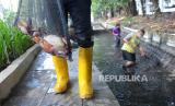 Untuk itu Dinas Pekerjaan Umum (DPU) Kota Bandung, membersihkan endapan lumpur anak Sungai Cikapayang, di komplek Balai Kota Bandung, kemudian ditanami ikan nila merah, Rabu (12/8).