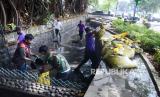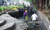 Sejumlah petugas dari Dinas Pekerjaan Umum (DPU) Kota Bandung, membersihkan endapan lumpur anak Sungai Cikapayang, di komplek Balai Kota Bandung, dipersiapkan untuk ditanamai ikan nila merah, Rabu (12/8). Keberadaan ikan tersebut, selain bagian dari estetik, juga berfungsi sebagai bioindikator kualitas air sungai. (FOTO : Edi Yusuf/Republika)