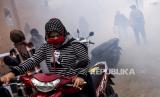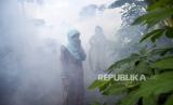 Sejumlah warga mengenakan masker saat berlangsungnya pengasapan (fogging) di lingkungan perumahan warga di Jalan Kihapit Barat, Kota Cimahi, Rabu (12/8). Pengasapan tersebut dilakukan sebagai salah satu upaya pencegahan penyebaran penyakit demam berdarah dengue (DBD) di kawasan tersebut. Foto: Abdan Syakura/Republika (FOTO : ABDAN SYAKURA/REPUBLIKA)