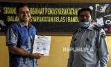 Mantan terpidana kasus korupsi Wisma Atlet Muhammad Nazaruddin (kiri) bersama Pembimbing Kemasyarakatan Madya Balai Pemasyarakatan (Bapas) Bandung Budiana (kanan) menunjukkan surat bebas murni di Balai Pemasyarakatan (Bapas) Kelas I Bandung, Jalan Ibrahim Adjie, Kota Bandung, Kamis (13/8). (FOTO : ABDAN SYAKURA/REPUBLIKA)