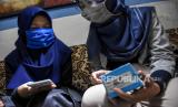 Anggota Komunitas Kangasoi (kanan) menjelaskan fitur ponsel kepada siswa sebelum diberikan di Jalan Anyer Dalam, Kebonwaru, Kota Bandung, Kamis (13/8). Kedua komunitas tersebut menggalang donasi berupa ponsel bekas berbasis android dan laptop yang disalurkan untuk siswa di berbagai wilayah Bandung guna dimanfaatkan untuk mengikuti pembelajaran jarak jauh (PJJ) secara daring selama pandemi Covid-19. Foto: Abdan Syakura/Republika (FOTO : ABDAN SYAKURA/REPUBLIKA)