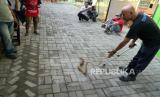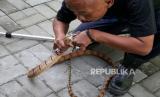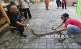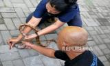 Pelatihan teknik memegang ular di Gamping, Sleman, Yogyakarta, Kamis (13/8). Bersama pegiat dan pecinta ular Jogja, warga diberikan teknik memegang ular. Mulai dari ular yang berbisa atau yang biasa. Warga juga diperbolehkan mencobanya dengan ular yang sudah disediakan. (FOTO : Wihdan Hidayat / Republika)