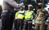 Aparat gabungan dari Polsek Bandung Kidul dan Satpol PP Kecamatan Bandung Kidul usai merazia warga yang tidak mengenakan masker di kawasan Pasar Kordon, Bandung, Jumat (14/8). Pelanggar didata dan diimbau untuk menaati protokol kesehatan dengan mengenakan masker saat bepergian. FOTO YOGI ARDHI (FOTO : Yogi Ardhi/Republika)