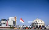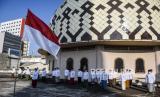 Pengurus Dewan Kemakmuran Masjid (DKM) Masjid Raya Bandung mengarak bendera merah putih usai mengikuti upacara Kemerdekaan Indonesia di area kubah Masjid Raya Bandung, Jalan Dalem Kaum, Kota Bandung, Senin (17/8). Upacara dengan menerapkan protokol kesehatan tersebut digelar dalam rangka memperingati HUT ke-75 Kemerdekaan Indonesia. (FOTO : ABDAN SYAKURA/REPUBLIKA)