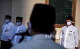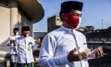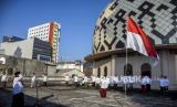 Pengurus Dewan Kemakmuran Masjid (DKM) Masjid Raya Bandung mengikuti upacara Kemerdekaan Indonesia di area kubah Masjid Raya Bandung, Jalan Dalem Kaum, Kota Bandung, Senin (17/8). Upacara dengan menerapkan protokol kesehatan tersebut digelar dalam rangka memperingati HUT ke-75 Kemerdekaan Indonesia. Foto: Abdan Syakura/Republika (FOTO : ABDAN SYAKURA/REPUBLIKA)