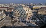 Foto udara pengurus Dewan Kemakmuran Masjid (DKM) Masjid Raya Bandung mengikuti upacara Kemerdekaan Indonesia di area kubah Masjid Raya Bandung, Jalan Dalem Kaum, Kota Bandung, Senin (17/8). Upacara dengan menerapkan protokol kesehatan tersebut digelar dalam rangka memperingati HUT ke-75 Kemerdekaan Indonesia. (FOTO : ABDAN SYAKURA/REPUBLIKA)