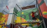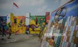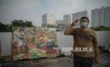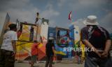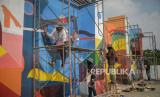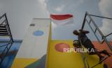 Seniman yang tergabung dalam komunitas gallery Pasar Seni Gembrong (G Art) melukis mural bersama di rooftop Gallery Pasar Seni Gembrong, Jakarta, Senin (17/8). Kegiatan tersebut dalam rangka memperingati HUT yang ke-75 Republik Indonesia serta pembukaan Pameran Demi Indonesia (Pamdemi) dengan tema Untuk Indonesia yang diikuti oleh tujuh belas pelukis yang digelar di seluruh Indonesia hingga 28 Desember 2020. Republika/Thoudy Badai (FOTO : Republika/Thoudy Badai)