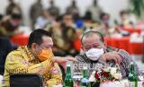 Ketua MPR Bambang Soesatyo (kiri) berbincang dengan Ketua DPD La Nyalla Mahmud Mattalitti disela-sela Hari Konstitusi 2020 di Gedung Nusantara IV, Kompleks Parlemen, Senayan, Jakarta, Selasa (18/8/2020). (FOTO : Antara/M Risyal Hidayat)