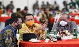 Ketua MPR Bambang Soesatyo (tengah) berbincang dengan Ketua BPK Agung Firman Sampurna (kiri) disaksikan Ketua DPD La Nyalla Mahmud Mattalitti (kanan) disela-sela Hari Konstitusi 2020 di Gedung Nusantara IV, Kompleks Parlemen, Senayan, Jakarta, Selasa (18/8/2020).  (FOTO : Antara/M Risyal Hidayat)