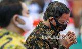 Menko Polhukam Mahfud MD (kanan) berdoa saat menghadiri Hari Konstitusi 2020 di Gedung Nusantara IV, Kompleks Parlemen, Senayan, Jakarta, Selasa (18/8/2020). (FOTO : Antara/M Risyal Hidayat)