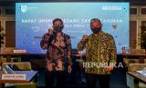 Direktur Utama Mahaka Media Adrian Syarkawi (kiri) bersama Direktur Mahaka Troy Reza Warokka memberikan paparan usai Rapat Umum Pemegang Saham (RUPS) Tahunan di Jakarta, Rabu (19/8). PT Mahaka Media Tbk mengalami peningkatan pendapatan usaha dari sektor iklan sebesar 37 persen dibandingkan periode sebelumnya dan meningkatkan likuiditas lancar yang ditunjukan dengan peningkatan rasio keuangan aset lancar terhadap liabilitas jangka pendek sebesar 9 persen. Republika/Putra M. Akbar (FOTO : Republika/Putra M. Akbar)