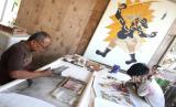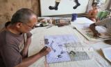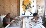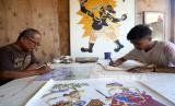 Perupa Subandi Giyanto (kiri) menyelesaikan lukisan wayang di Bangunjiwo, Bantul, Yogyakarta, Rabu (19/8). Sejak kecil Subandi menggeluti dunia membuat wayang, ini memengaruhi karyanya hingga kini. Subandi lebih terkenal dengan lukisan wayang dengan media kaca. Namun, ternyata lukisan wayangnya juga dengan kanvas, logam, atau patung. Terkadang workshop Subandi juga menjadi rujukan belajar mahasiswa dalam dan luar negeri. (FOTO : Wihdan Hidayat / Republika)