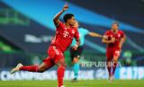 Serge Gnabry merayakan golnya setelah mencetak keunggulan 1-0 pada pertandingan semifinal Liga Champions antara Olympique Lyon dan Bayern Munich di Lisbon, Portugal, pada Rabu (19/8). Sejak menjuarai Liga Champions pada 2013, Bayern Muenchen belum pernah lagi lolos ke babak final. (FOTO : Miguel A. Lopes / POOL/EPA POOL)