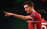 Robert Lewandowski merayakan keunggulan 3-0 pada pertandingan semifinal Liga Champions antara Olympique Lyon dan Bayern Munich di Lisbon, Portugal, pada Rabu (19/8). (FOTO : Franck Fife / POOL/AFP POOL)