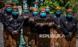 Dewan Adat Kasepuhan Girikusumo dengan mengenakan masker mengirab kotak berisi jubah pusaka peninggalan leluhur dalam prosesi Tradisi Kirab Sura Girikusumo di Desa Banyumeneng, Mranggen, Demak, Jawa Tengah, Kamis (20/8/2020). Tradisi menyambut tahun baru Islam 1 Muharram 1442 Hijriyah atau satu Sura yang biasanya dihadiri ribuan warga itu, kali ini hanya dihadiri keluarga besar Kasepuhan Girikusumo dengan menerapkan sejumlah protokol kesehatan guna mencegah penyebaran COVID-19. (FOTO : Antara/Aji Styawan)
