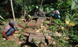 REPUBLIKA.CO.ID, KLATEN -- Sejumlah warga mencabuti rumput yang tumbuh diantara batu candi saat aksi membersihkan candi di Candi Tibayan, Jatinom, Klaten, Jawa Tengah, Ahad (23/8/2020).