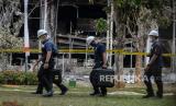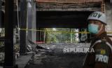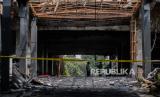 Petugas berjaga di area Gedung Utama Kejaksaan Agung Republik Indonesia yang terbakar pada Sabtu (22/8) malam, di Jakarta, Senin (24/8). Berdasakrkan pantauan tim Puslabfor terlihat membawa koper hitam serta sempat menerbang drone saat olah TKP yang dilakukan secara tertutup, hingga saat ini belum diketahui penyebab terjadinya kebakaran yang melanda gedung tersebut. (FOTO : Republika/Thoudy Badai)