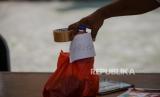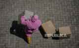 Petugas keamanan mengemas kiriman makanan dari keluarga pasien COVID-19 tanpa gejala di Gelanggang Olahraga Remaja (GOR) Tambora, Jakarta, Rabu (26/8). Menurut Kasudin Kesahatan Jakarta Barat, Kristi Wathini penempatan GOR Tambora sebagai tempat isolasi dilakukan karena belasan warga yang terinfeksi COVID-19 tidak memiliki tempat untuk isolasi mandiri yang layak mengingat kawasan Tambora merupakan pemukiman terpadat se-Asia Tenggara. (FOTO : Republika/Thoudy Badai)