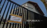 Papan informasi terpasang di Gelanggang Olahraga Remaja (GOR) Tambora, Jakarta, Rabu (26/8). Menurut Kasudin Kesahatan Jakarta Barat, Kristi Wathini penempatan GOR Tambora sebagai tempat isolasi dilakukan karena belasan warga yang terinfeksi COVID-19 tidak memiliki tempat untuk isolasi mandiri yang layak mengingat kawasan Tambora merupakan pemukiman terpadat se-Asia Tenggara. (FOTO : Republika/Thoudy Badai)