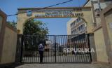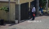 Petugas keamanan berjaga di area Gelanggang Olahraga Remaja (GOR) Tambora, Jakarta, Rabu (26/8). Menurut Kasudin Kesahatan Jakarta Barat, Kristi Wathini penempatan GOR Tambora sebagai tempat isolasi dilakukan karena belasan warga yang terinfeksi COVID-19 tidak memiliki tempat untuk isolasi mandiri yang layak mengingat kawasan Tambora merupakan pemukiman terpadat se-Asia Tenggara. (FOTO : Republika/Thoudy Badai)