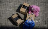 Petugas medis menggunakan alat pelindung diri (APD) saat mengemas sampah medis di Gelanggang Olahraga Remaja (GOR) Tambora, Jakarta, Rabu (26/8). Menurut Kasudin Kesahatan Jakarta Barat, Kristi Wathini penempatan GOR Tambora sebagai tempat isolasi dilakukan karena belasan warga yang terinfeksi COVID-19 tidak memiliki tempat untuk isolasi mandiri yang layak mengingat kawasan Tambora merupakan pemukiman terpadat se-Asia Tenggara. (FOTO : Republika/Thoudy Badai)