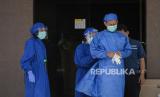 Petugas medis bersiap menggunakan alat pelindung diri (APD) saat akan beraktivitas di Gelanggang Olahraga Remaja (GOR) Tambora, Jakarta, Rabu (26/8). Menurut Kasudin Kesahatan Jakarta Barat, Kristi Wathini penempatan GOR Tambora sebagai tempat isolasi dilakukan karena belasan warga yang terinfeksi COVID-19 tidak memiliki tempat untuk isolasi mandiri yang layak mengingat kawasan Tambora merupakan pemukiman terpadat se-Asia Tenggara. (FOTO : Republika/Thoudy Badai)