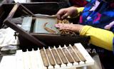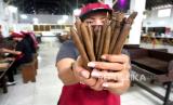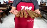 Pekerja menunjukan produk cerutu di Pabrik Cerutu Tarumartani, Yogyakarta, Rabu (26/8). Selain untuk pasar lokal dalam skala kecil, cerutu produksi Tarumartani sudah menjangkau pasar Eropa, Amerika, dan Asia. Ada sekitar 20 hingga 30 merk produk turunan tembakau yang dihasilkan di sini. Namun, selama pandemi permintaan tertinggi justru tembakau iris. Kenaikan hingga tiga kali lipat dibanding tahun lalu. Per minggu kapasitas produksi sembilan ton untuk tembakau iris. (FOTO : Wihdan Hidayat / Republika)