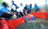 Wali Kota Bandung Oded M Danial menabur ikan lele sebagai salah satu aplikasi dari program Urban Farming serta program Kurangi, Pisahkan dan Manfaatkan (Kang Pisman), di halaman belakang kantor di Kantor Kecamatan Mandalajati, Jalan Pasir Impun, Kota Bandung, Selasa (26/8). Dalam kesempatan itu dilakukan juga sosialisasi program bayar pajak PBB dengan sampah inovasi hasil kerjasama Badan Pengelolaan Pendapatan Daerah (BPPD) Kota Bandung, dengan Kecamatan Mandalajati, program bank sampah dan Bank BJB. Diharapkan program ini bisa diikuti oleh kecamatan lainnya agar terbentuk kemandirian masyarakat. (FOTO : Edi Yusuf/Republika)