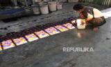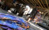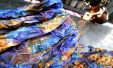 Pekerja menyelesaikan pembuatan batik model smoke di Grogol, Sukoharjo, Jawa Tengah, Kamis (27/8). Batik cap smoke ini digemari pasar lokal dan ekspor. Biasanya perusahaan atau pabrik besar mengalihkan produksi batiknya di industri rumahan untuk memenuhi kapasitas. Kain diberikan aneka warna dan selanjutnya dicap sesuai dengan motif yang dikehendaki. Batik cap smoke ini biasanya dijual ke pasar mulai dari harga Rp 80 ribu per lembarnya. (FOTO : Wihdan Hidayat / Republika)