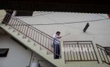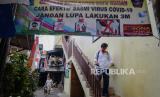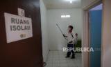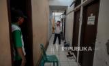 Warga menyemprotkan cairan disinfektan di indeskos yang dijadikan ruangan isolasi mandiri untuk warga di Jalan Poncol RW 05, Kuningan Barat, Jakarta, Jumat (28/8). Penyediaan ruangan isolasi mandiri tersebut digagas atas dasar inisiatif warga setempat untuk mengantisipasi penyebaran virus corona di lingkungan warga. (FOTO : Republika/Thoudy Badai)