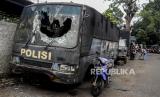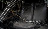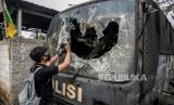 REPUBLIKA.CO.ID, JAKARTA -- Seorang jurnalis mengambil gambar salah satu mobil yang hancur di kawasan Ciracas, Jakarta, Sabtu, (29/8).