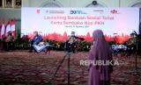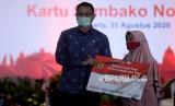 REPUBLIKA.CO.ID, JAKARTA -- Menteri Sosial Juliari P Batubara menyerhakan secara simbolis kepada perwakilan penerima Bantuan Sosial Tunai Kartu Sembako Non PKH di Jakarta, Senin (31/8).