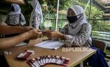 Sejumlah pelajar melakukan registrasi kartu perdana yang dibagikan untuk belajar online di SMK Negeri 8 Jakarta, Kamis (3/9).