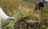 Petani memotong padi saat panen di area persawahan Desa Alue Tampak, Kecamatan Kaway XVI, Aceh Barat, Aceh, Kamis (3/9/2020). Direktur Utama Perum Bulog Budi Waseso menargetkan realisasi serapan gabah petani sepanjang tahun 2020 dapat melebihi target sebesar 1,4 juta ton seiring Bulog mendapat penugasan penyaluran beras untuk program bantuan sosial (Bansos) dari Kementerian Sosial. (FOTO : SYIFA YULINNAS/ANTARA )