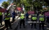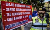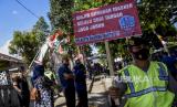 Anggota Polresta Bandung membawa poster saat sosialisasi protokol kesehatan di area Kantor KPU Kabupaten Bandung, Jalan Sindang Wargi, Soreang, Kabupaten Bandung, Jumat (4/9). Sosialisasi tersebut bertujuan untuk mengajak masyarakat agar disiplin menerapkan protokol kesehatan dalam semua tahapan Pilkada serentak tahun 2020 guna meminimalisir penyebaran Covid-19. Foto: Abdan Syakura/Republika (FOTO : ABDAN SYAKURA/REPUBLIKA)