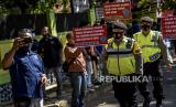 Anggota Polresta Bandung mengenakan masker saat sosialisasi protokol kesehatan di area Kantor KPU Kabupaten Bandung, Jalan Sindang Wargi, Soreang, Kabupaten Bandung, Jumat (4/9). Sosialisasi tersebut bertujuan untuk mengajak masyarakat agar disiplin menerapkan protokol kesehatan dalam semua tahapan Pilkada serentak tahun 2020 guna meminimalisir penyebaran Covid-19. Foto: Abdan Syakura/Republika (FOTO : ABDAN SYAKURA/REPUBLIKA)