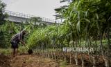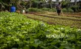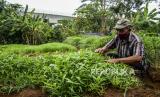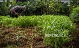 Daniel Agus Setiyadi (70) saat mencangkul di lahan pertanian miliknya di kawasan Ciracas, Jakarta, Jumat (4/9). Menurutnya omzet yang didapat dari kesehariannya bercocok tanam mengalami penurunan drastis sejak pandemi Covid-19, akibat mahalnya harga bibit dan pupuk yang semakin mahal, tapi penjualan menurun banyak. Dalam satu hari yang biasanya bisa menghasilkan 1.500-2.000 ikat sayuran, kini hanya bisa menghasilkan 25-50 ikat serta kendala distribusi yang biasanya dipasarkan melalui tengkulak sekarang hanya bisa dijual dari rumah ke rumah. Republika/Putra M. Akbar (FOTO : Republika/Putra M. Akbar)