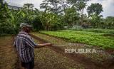 Daniel Agus Setiyadi (70) menyiram tanaman di lahan pertanian miliknya di kawasan Ciracas, Jakarta, Jumat (4/9). Menurutnya omzet yang didapat dari kesehariannya bercocok tanam mengalami penurunan drastis sejak pandemi Covid-19, akibat mahalnya harga bibit dan pupuk yang semakin mahal, tapi penjualan menurun banyak. Dalam satu hari yang biasanya bisa menghasilkan 1.500-2.000 ikat sayuran, kini hanya bisa menghasilkan 25-50 ikat serta kendala distribusi yang biasanya dipasarkan melalui tengkulak sekarang hanya bisa dijual dari rumah ke rumah. Republika/Putra M. Akbar (FOTO : Republika/Putra M. Akbar)